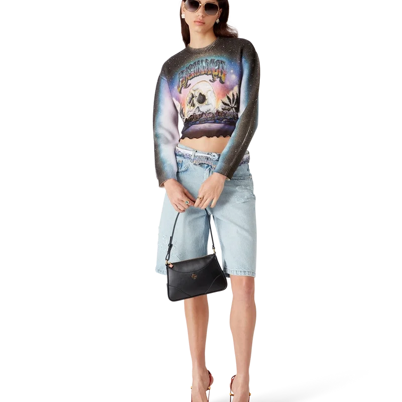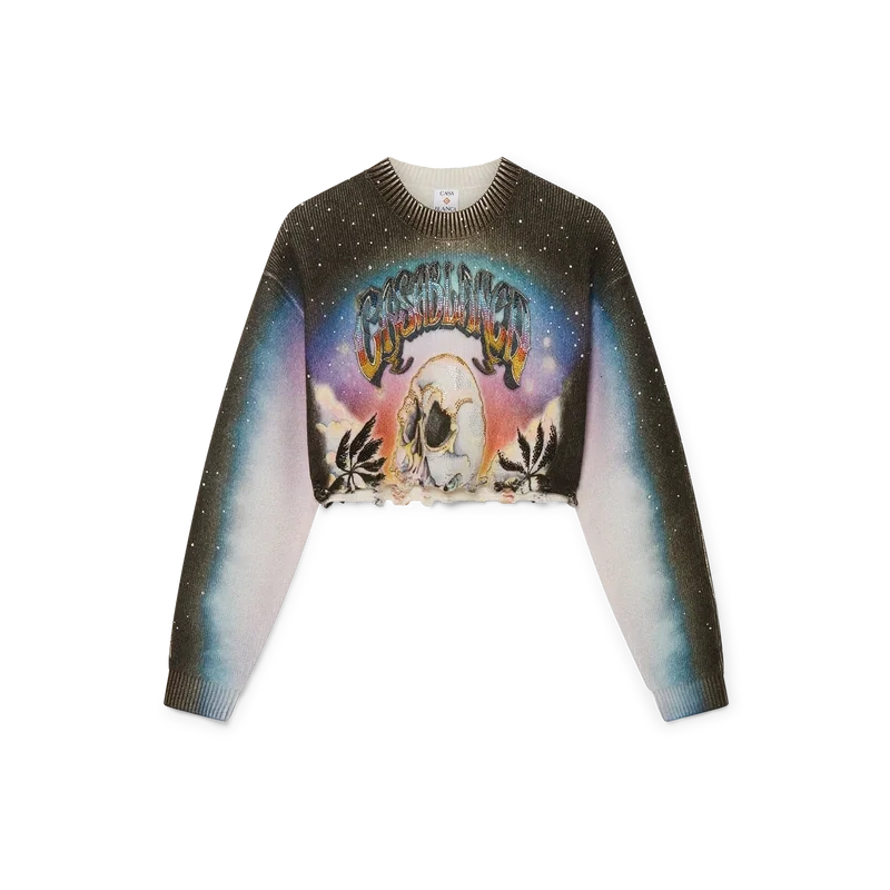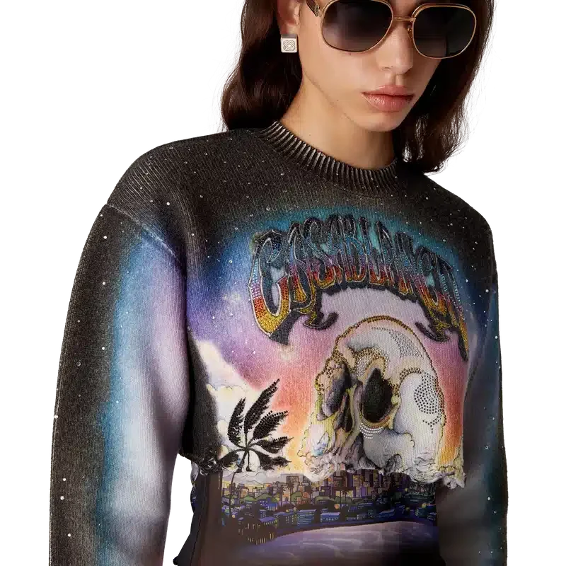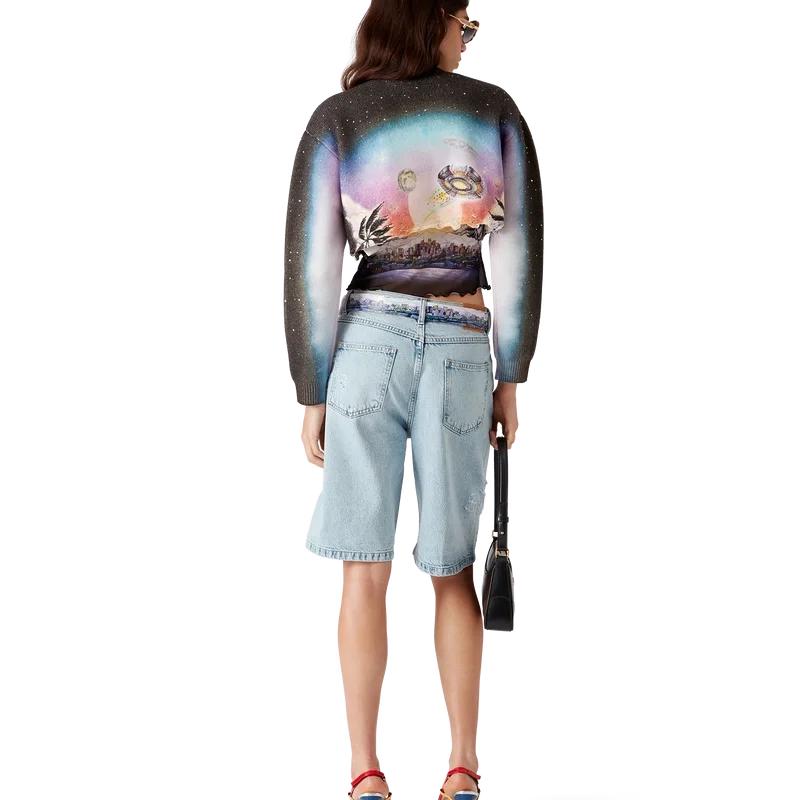 Puloverul scurt din amestec de cașmir La Pramonition este un model cu pantaloni scurți, confecționat dintr-un material de lână imprimat cu motivul sezonului, inspirat de o viziune misterioasă a orizontului orașului Los Angeles pe timp de noapte, cu elemente OZN care fac referire la inspirația sci-fi vintage. Completat cu guler clasic cu nervuri și manșete cu nervuri.