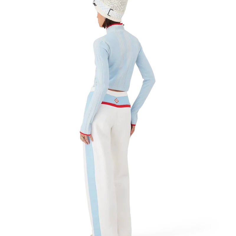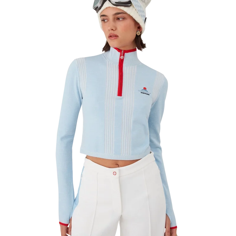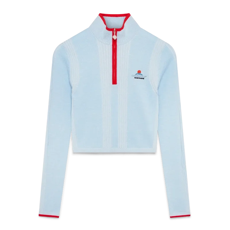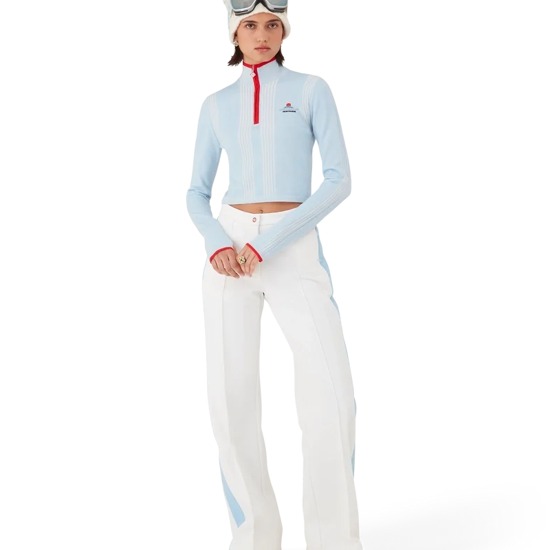 Topul scurt Ski Merino Base Layer este un model rafinat Apras-Sport, confecționat din țesătură de lână merino în culoarea albastră, inspirat de amurgul profund care se așterne peste peisajul montan al Japoniei. Inspirat de frumusețea serenă a luminii de seară care aruncă umbre albastre peste văile acoperite de zăpadă, designul îmbină eleganța sport-leisure. Completat cu o închidere cu fermoar roșu contrastant, care prezintă capetele de fermoar cu Diamond Monogram, semnătura casei.