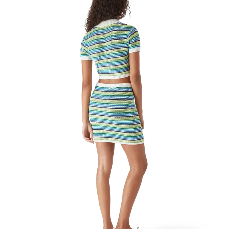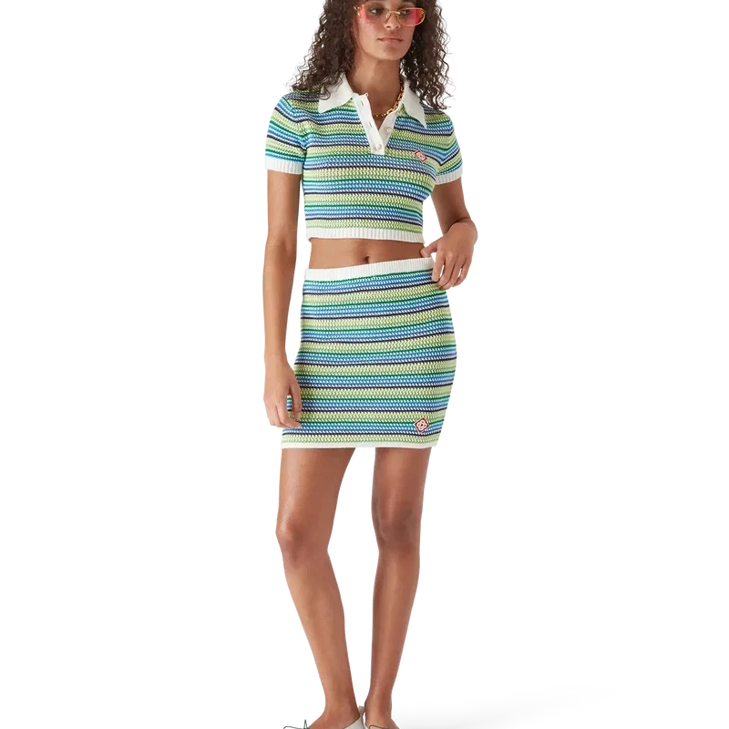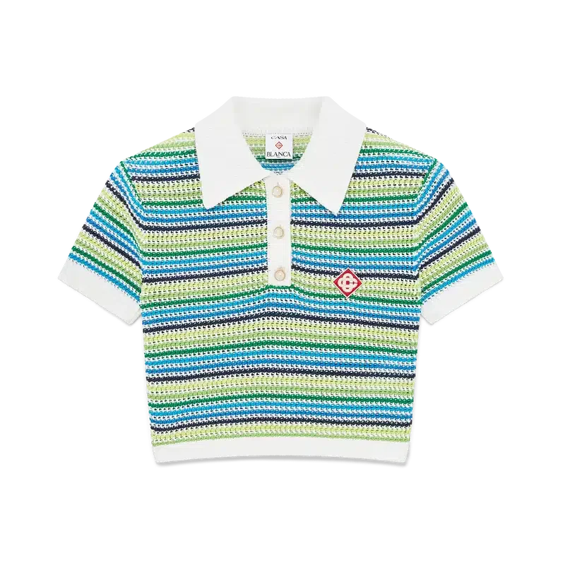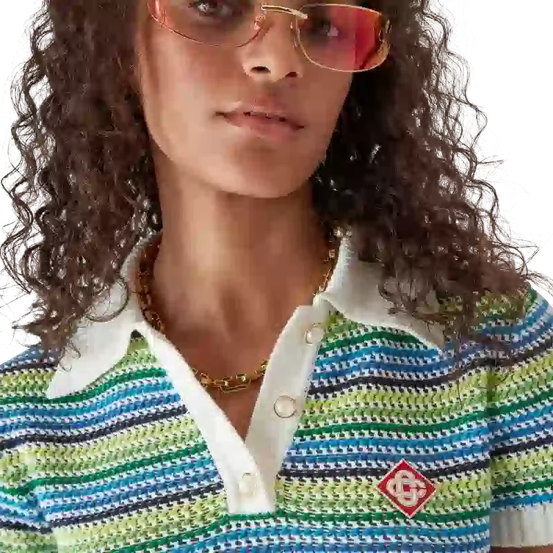 Tricouri polo cu pantaloni scurți au un design scurt, cu mâneci scurte, și prezintă logo-ul diamant caracteristic al casei. Este realizat din țesătură tricotată cu dungi, are o placket cu nasturi, nasturi cu margini aurii și perle, precum și guler, manșete și tiv cu detalii din tricot cu nervuri.