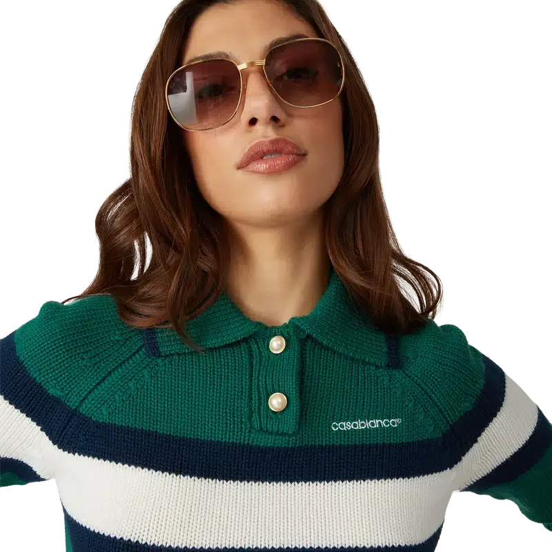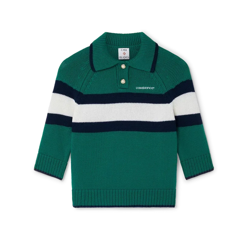 Tricoul polo cu blocuri de culoare are un design scurt, cu mâneci lungi, confecționat din țesătură de lână merino și prezintă o dungă albastră și albă pe piept și pe spate. Este completat cu mâneci raglan, manșete, tiv și guler cu nervuri, nasturi cu margini aurii și logo Casablanca.<!–