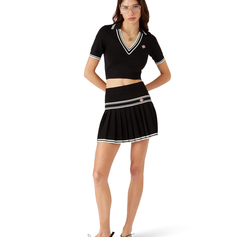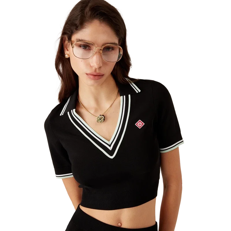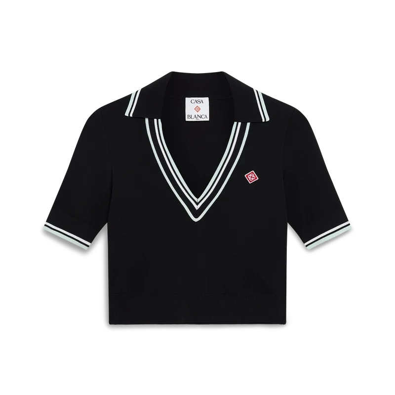Tricoul polo din viscoză cu guler în V este un model scurt, confecționat dintr-un material tricotat și decorat cu logo-ul în formă de romb, emblematic pentru brand. Prezintă guler, manșete și tiv cu nervuri, cu detalii în dungi contrastante verzi și albe, precum și un guler adânc în V.