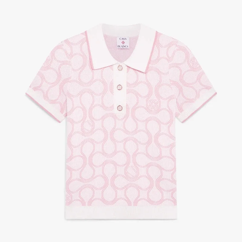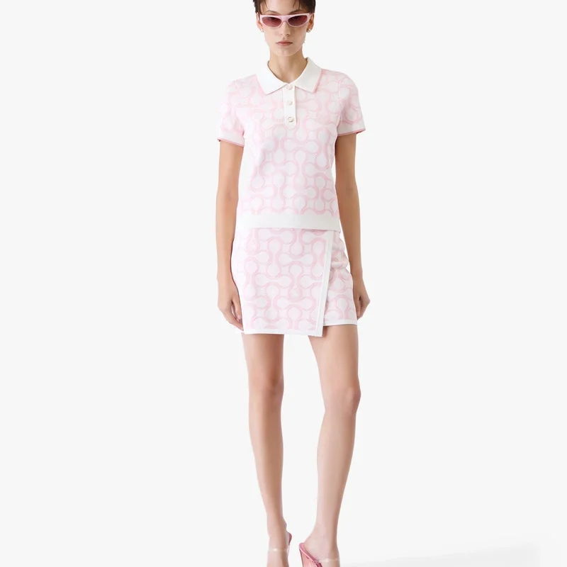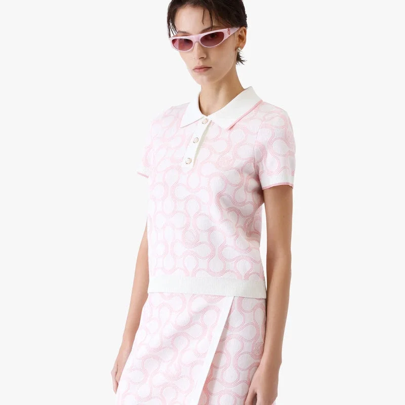 Tricoul polo Optic Drop este un design rafinat din tricot, prezentând grafica sezonului în paleta de culori Bourgeois a casei de modă. Completat cu guler clasic cu nervuri, placket, manșete și tiv cu detalii contrastante la margini, închidere cu nasturi, nasturi cu margine aurie și mâneci scurte într-o siluetă slim. Conceput pentru a fi purtat cu fusta mini asortată.