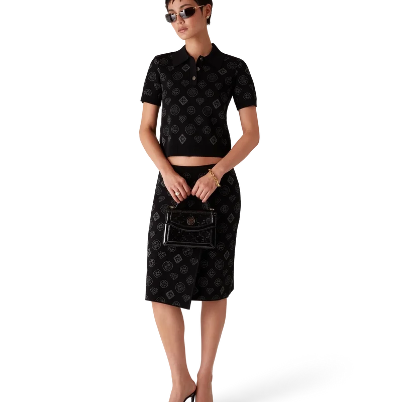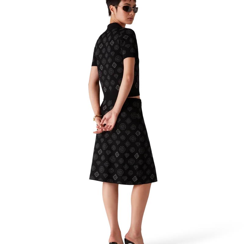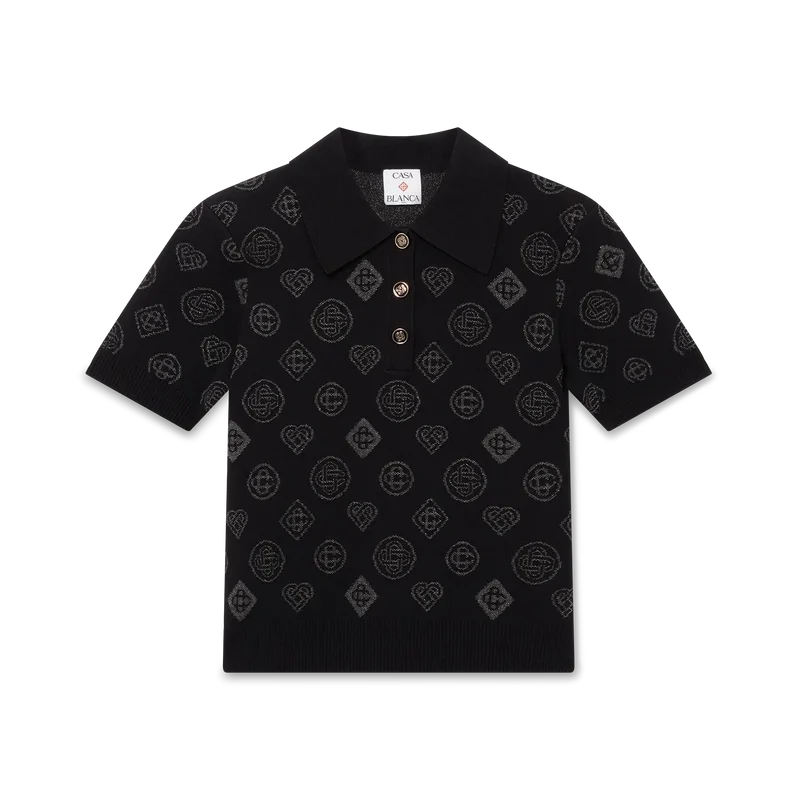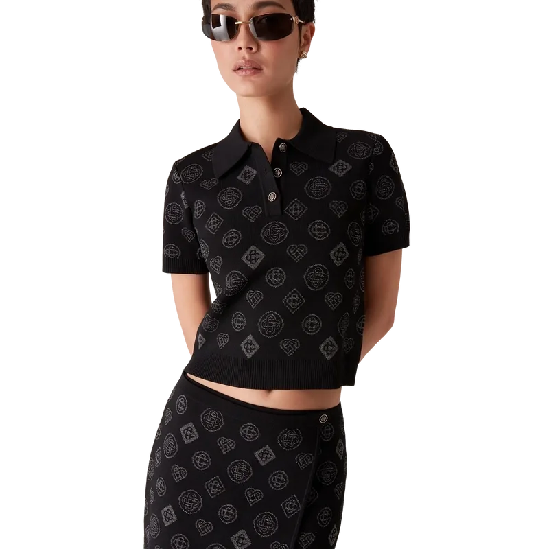 Tricoarea polo Monogram Jacquard este un model cu mâneci scurte, care prezintă logo-ul Honeydew al casei repetat. Acest model diferă de celelalte monograme ale noastre, deoarece combină forme unice pentru a forma un model coerent. Este mai degrabă un design bazat pe icoane. Completat cu închidere cu nasturi, nasturi placati cu aur cu logo-ul interconectat CC, guler, manșete și tiv din tricot.