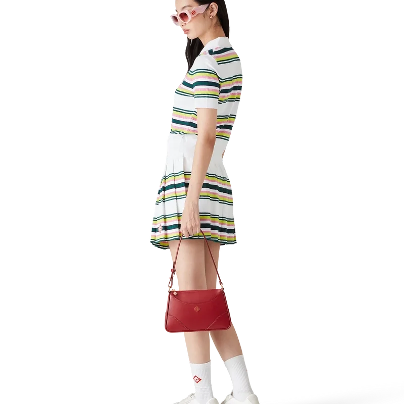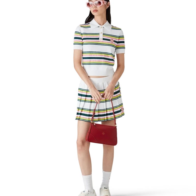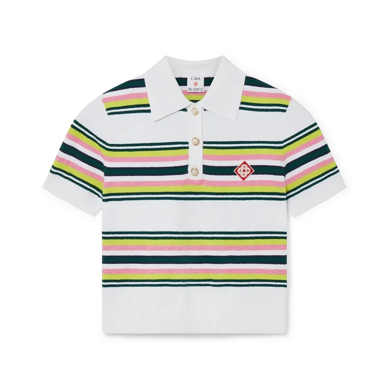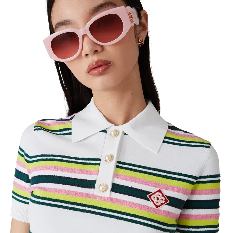 Tricoul polo cu dungi este un model cu mâneci scurte, confecționat din țesătură tricotată cu dungi, cu logo-ul diamant caracteristic al casei. Completat cu nasturi cu margine aurie și perle, placket cu trei nasturi, precum și manșete, tiv, guler și placket din tricot rib.