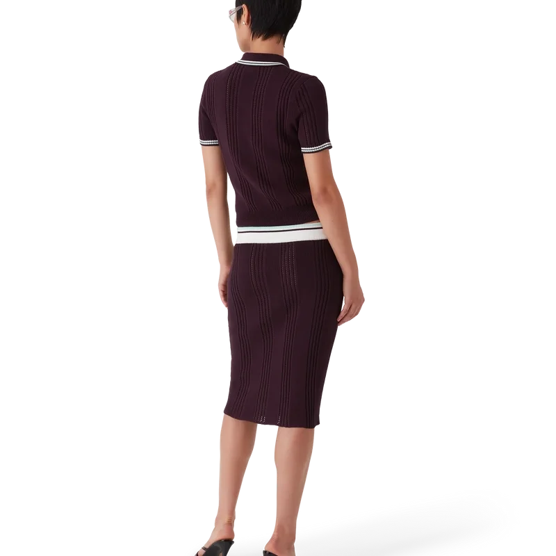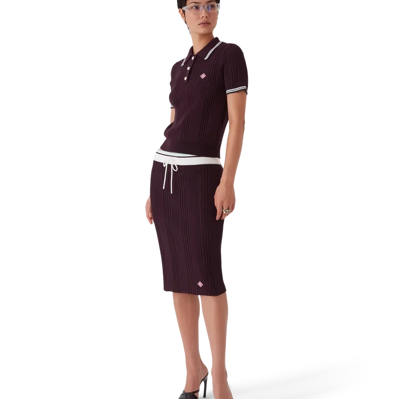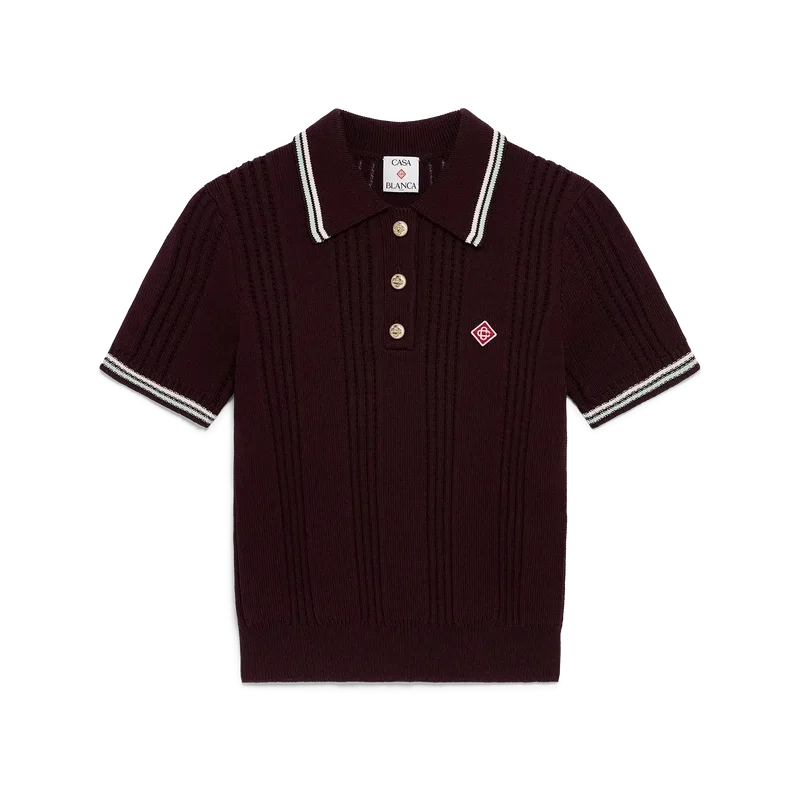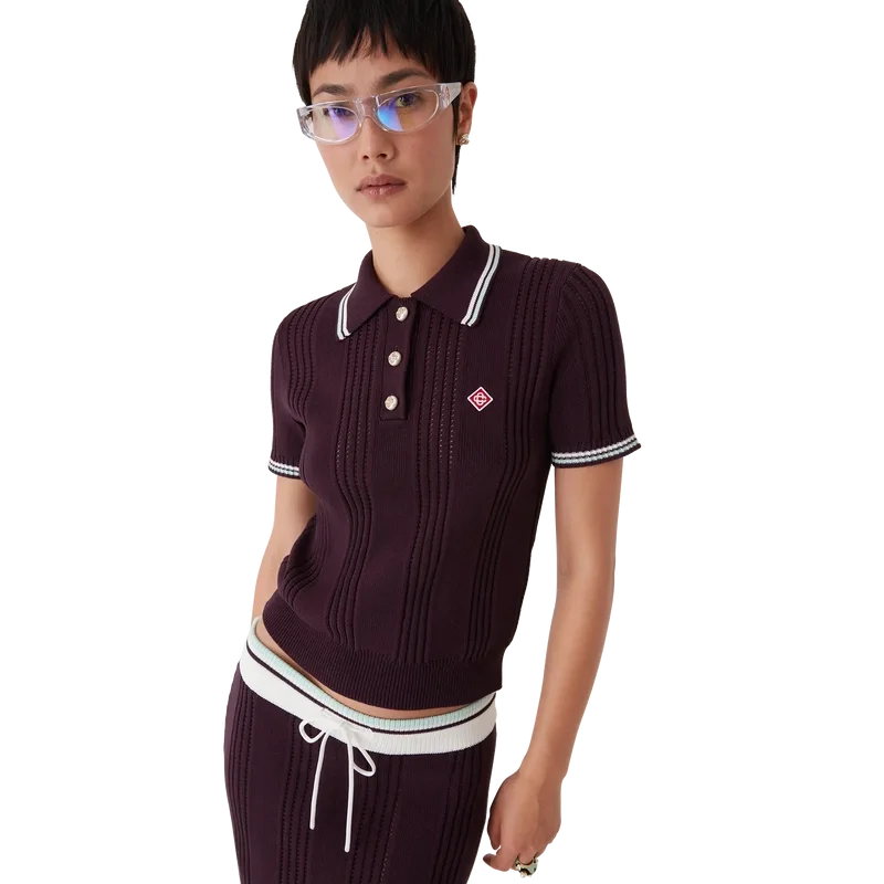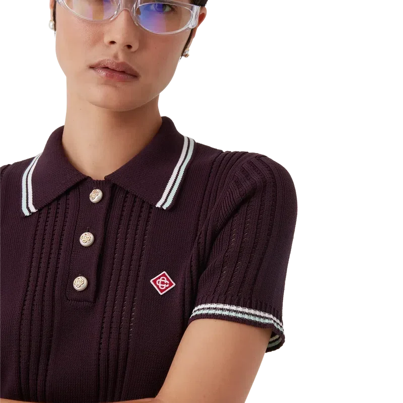 Tricoana polo cu pantaloni scurți din tricot de bumbac are un design clasic, cu logo-ul diamant caracteristic casei, fiind confecționat din țesătură de bumbac. Este completat de guler și manșete cu nervuri, tiv elastic, nasturi aurii cu margine de perle și detalii cu dungi pe guler și manșete.
