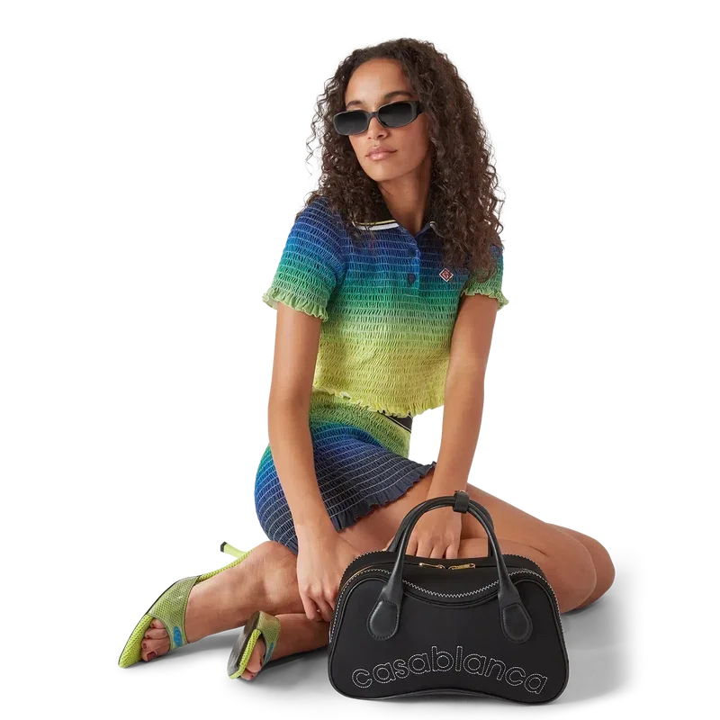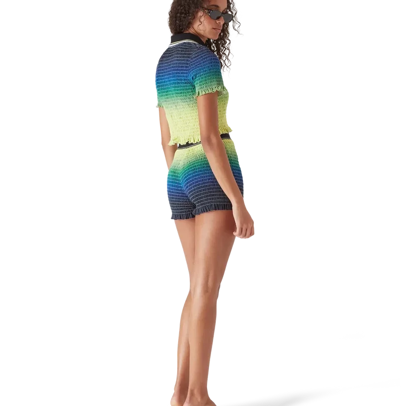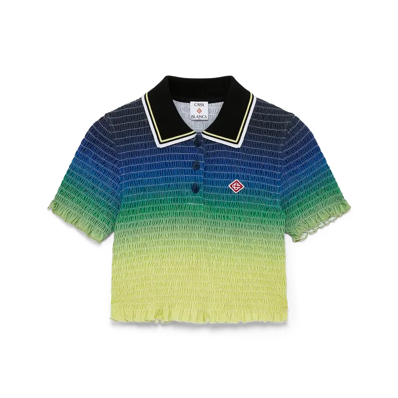 Tricoul polo cu volane și efect de degrade este un model scurt, care prezintă paleta de culori degrade a sezonului și logo-ul diamant caracteristic al casei. Este completat cu guler cu nervuri, mâneci scurte, închidere cu trei nasturi și detalii cu volane la manșete și tiv. Conceput pentru a se potrivi deasupra buricului.