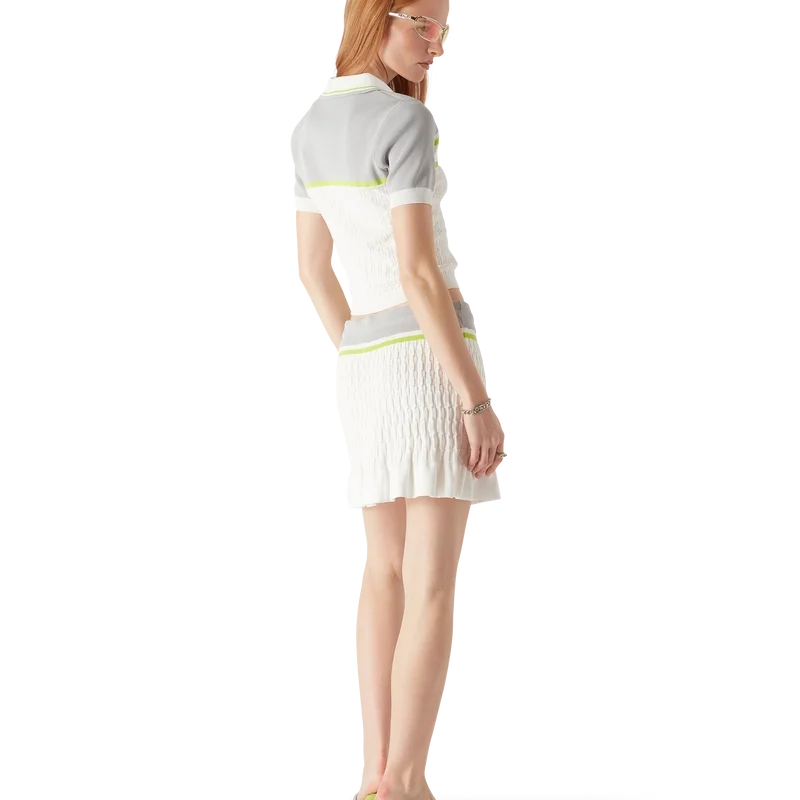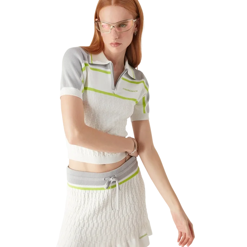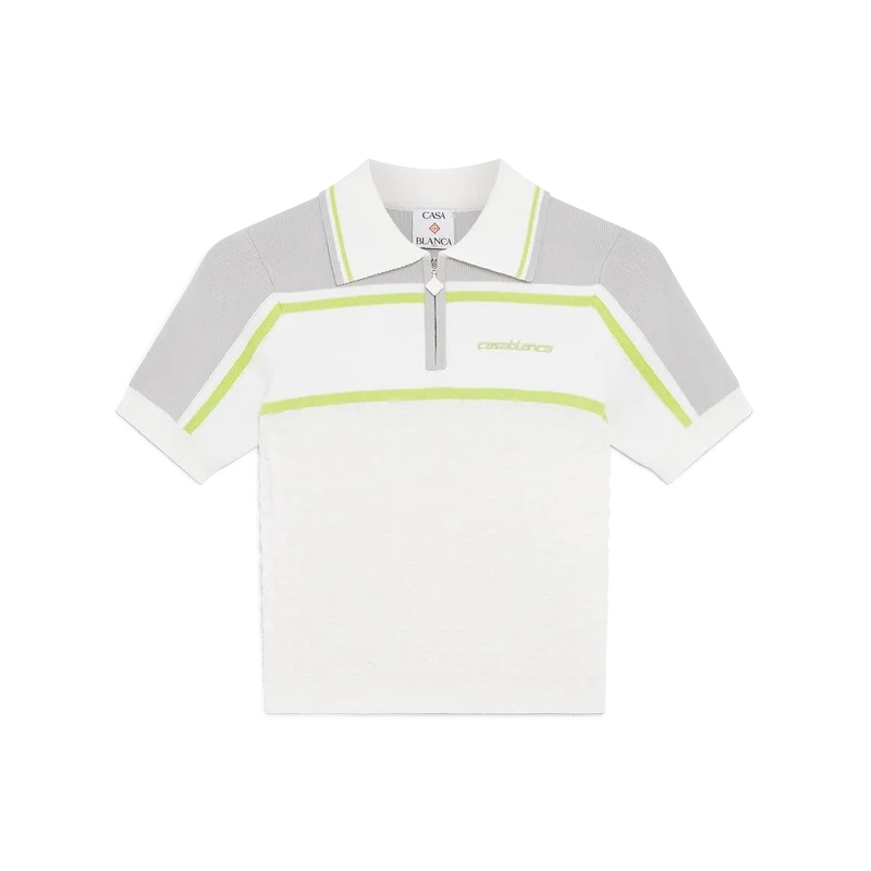 Tricoul polo de tenis este un design tricotat, cu umeri și mâneci exterioare în culori contrastante. Este prevăzut cu închidere cu fermoar, guler cu detalii cu margini în dungi, logo-ul Casablanca și detalii cu nervuri la mâneci și tiv.