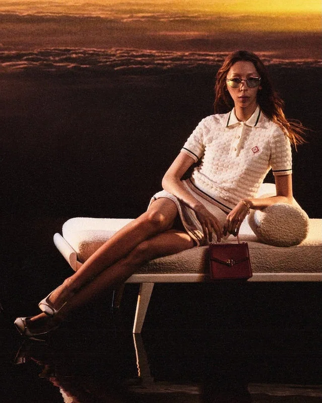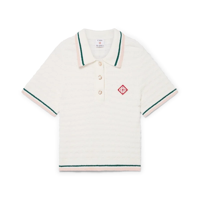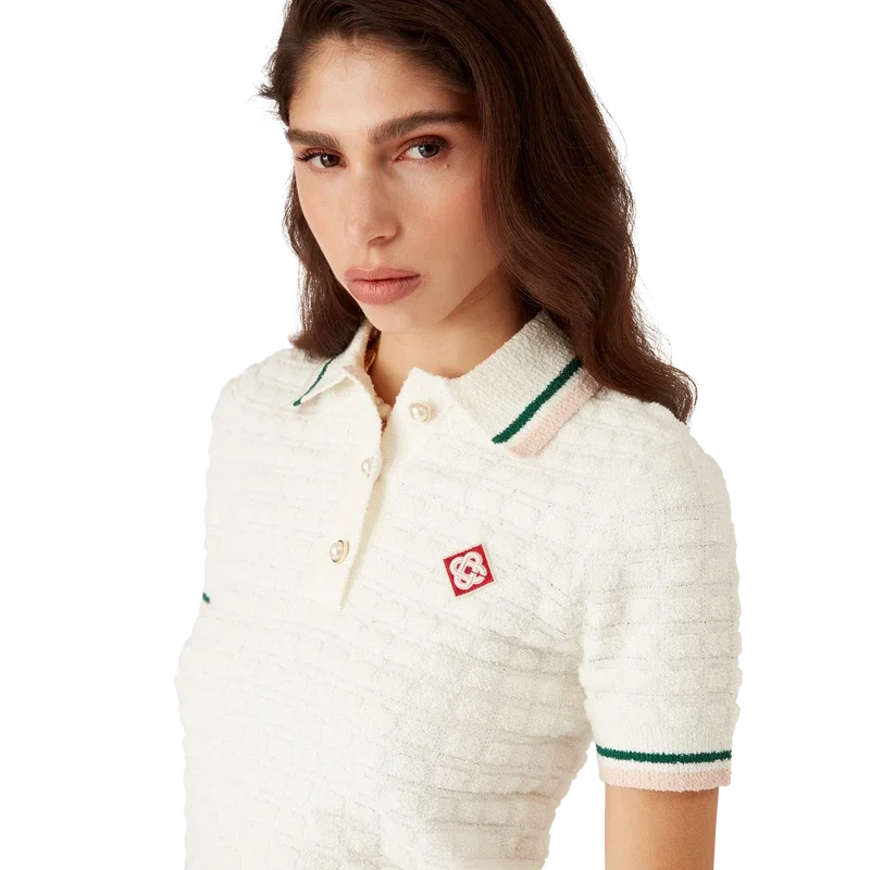 Tricoul polo din bumbac bouclé este confecționat din țesătură de bumbac bouclé și prezintă logo-ul diamant caracteristic al casei. Este completat cu nasturi cu margine aurie și perle, guler, manșete și tiv cu detalii cu dungi roz, albe și verzi.