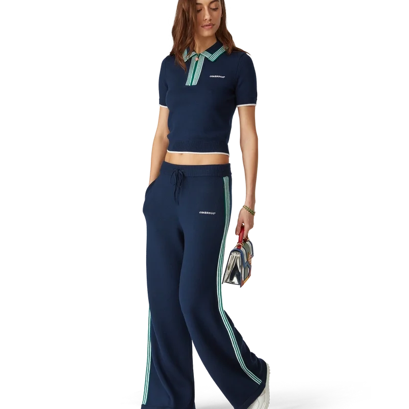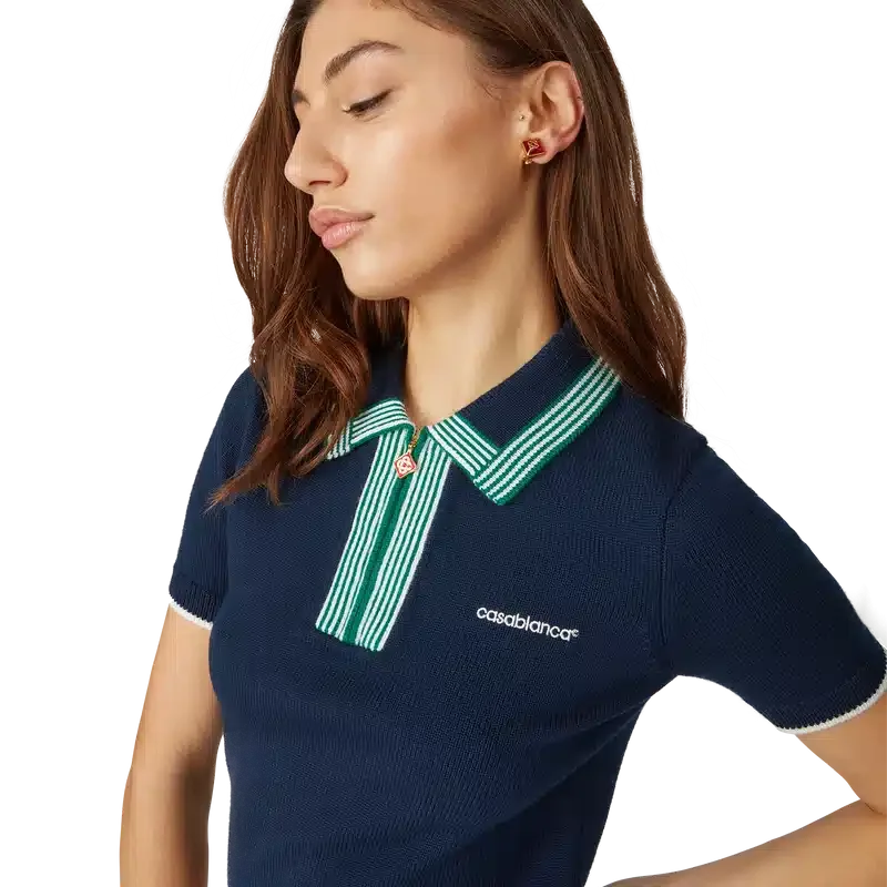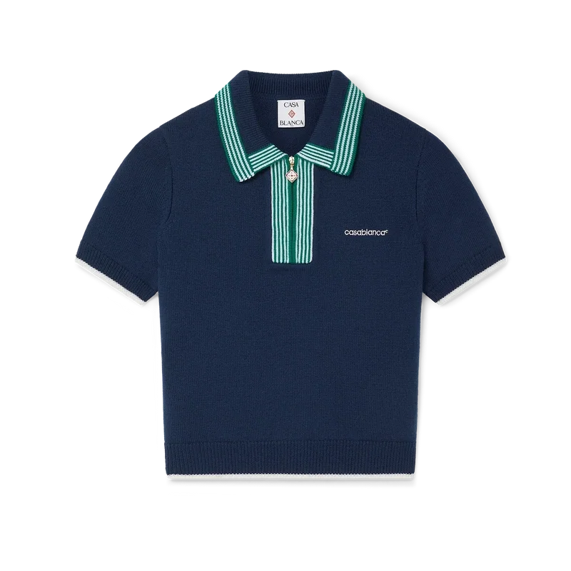 Tricoul polo din tricot este un model clasic confecționat dintr-un material din lână merino. Prezintă detalii cu margini cu nervuri contrastante la mâneci, tiv, guler și placket, închidere cu fermoar în față, guler cu nervuri și logo Casablanca.