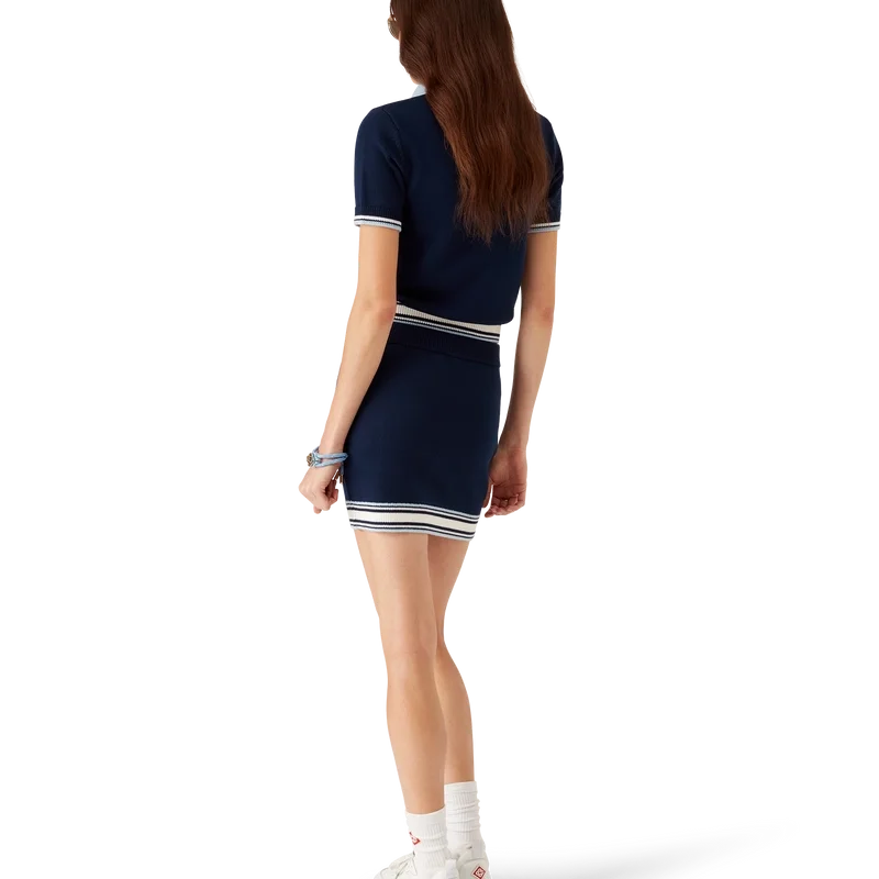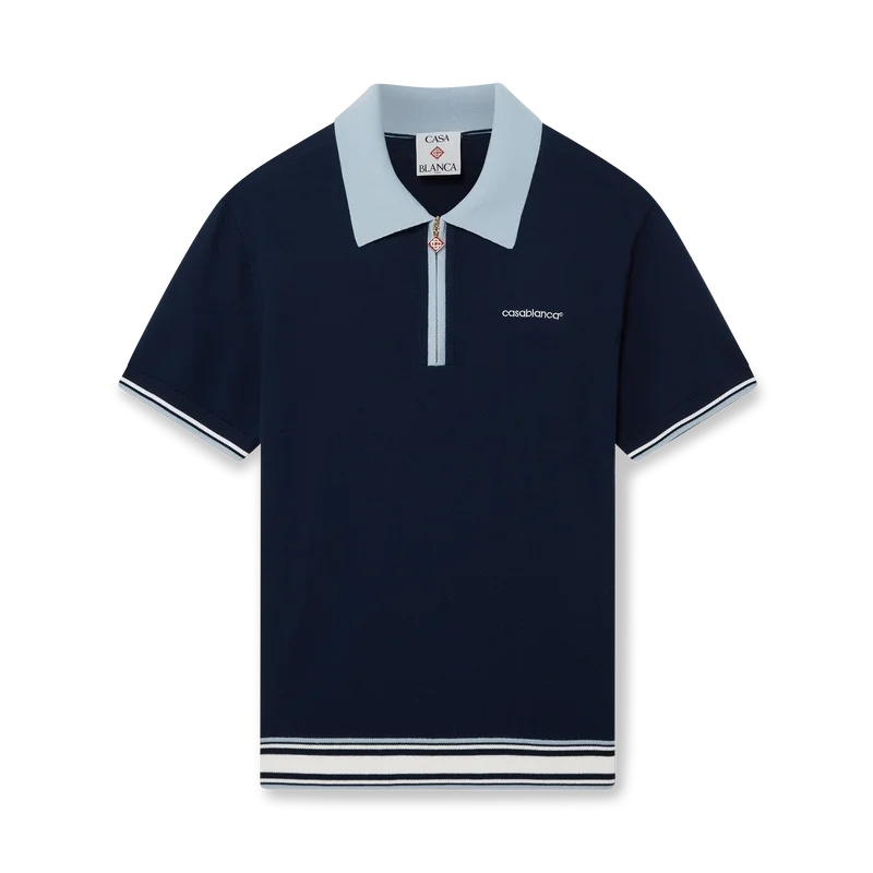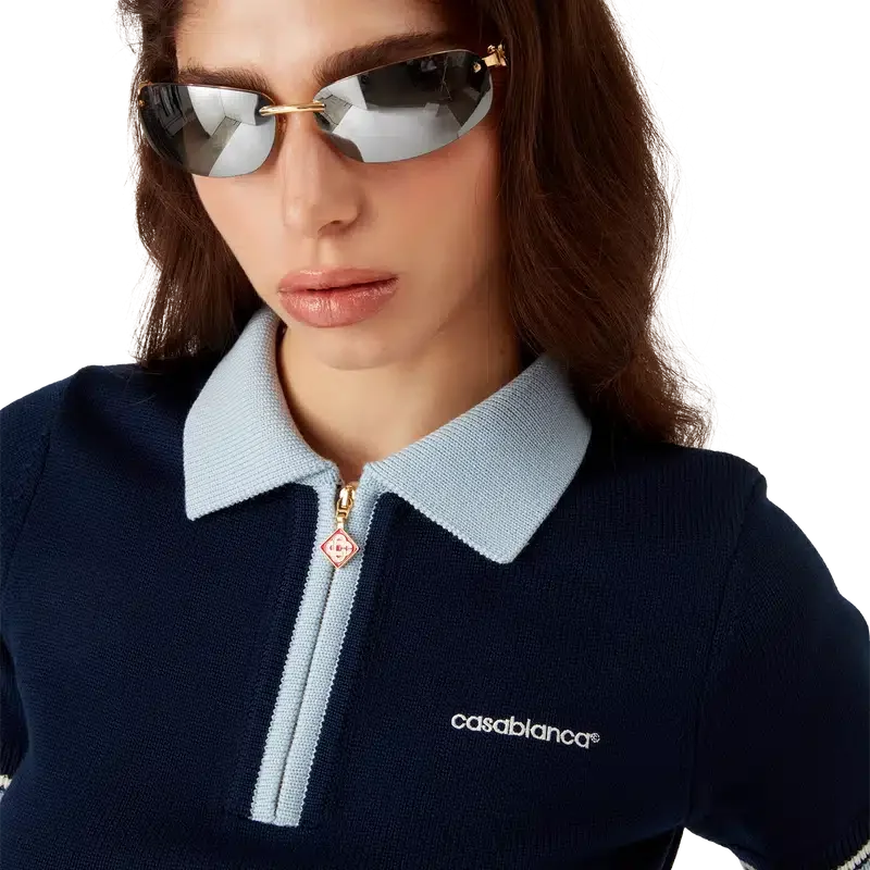 Tricoul polo de tenis din tricot merino este un model cu mâneci scurte, confecționat din țesătură de lână merino. Prezintă închidere cu fermoar, știft de fermoar cu logo-ul diamant caracteristic, detalii cu dungi la tiv și manșete, guler și placket cu nervuri în contrast și logo-ul Casablanca al casei.