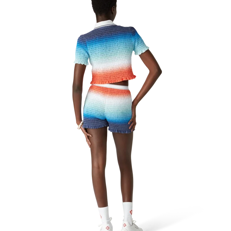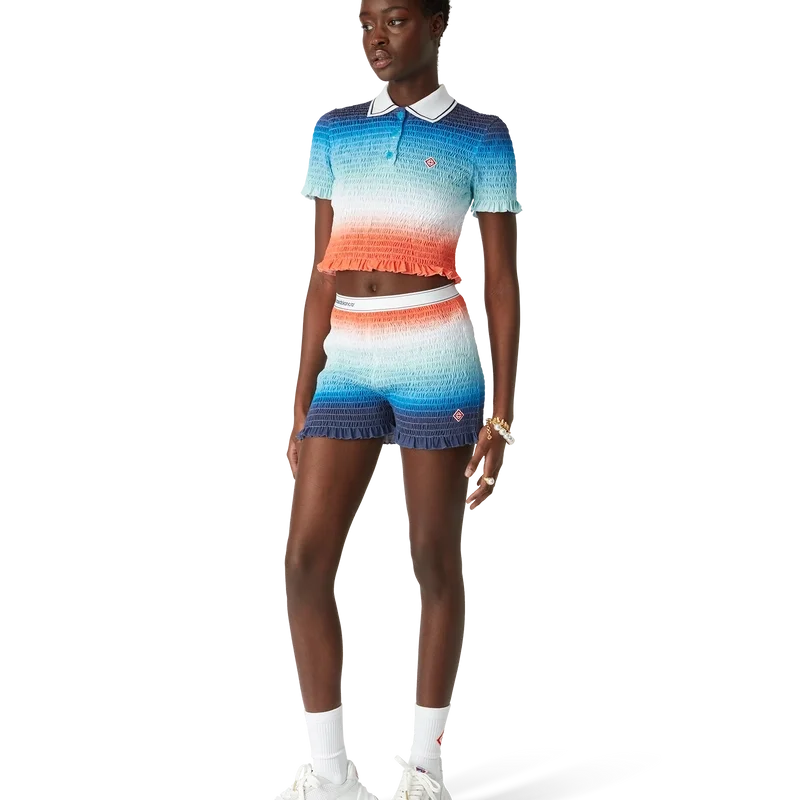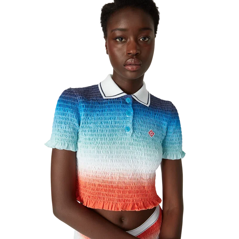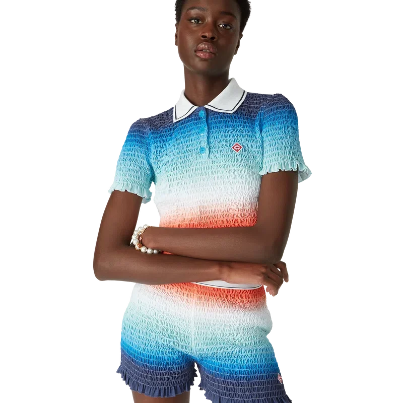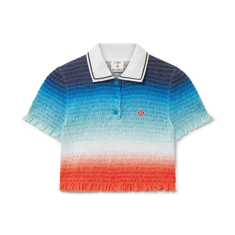 Tricoul polo cu gradient este un model de pantaloni scurți, imprimat integral, care prezintă imprimeul sezonier vibrant al casei, cu un gradient de albastru intens care trece prin nuanțe de roz până la portocaliu vibrant, reprezentând cerul schimbător al verii, scufundându-se în orizontul oceanului, făcând aluzie la pânza în continuă schimbare a naturii și la logo-ul cu diamant al casei.