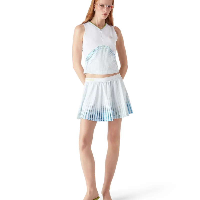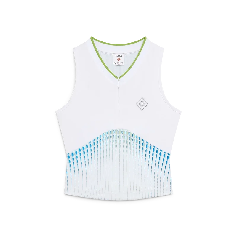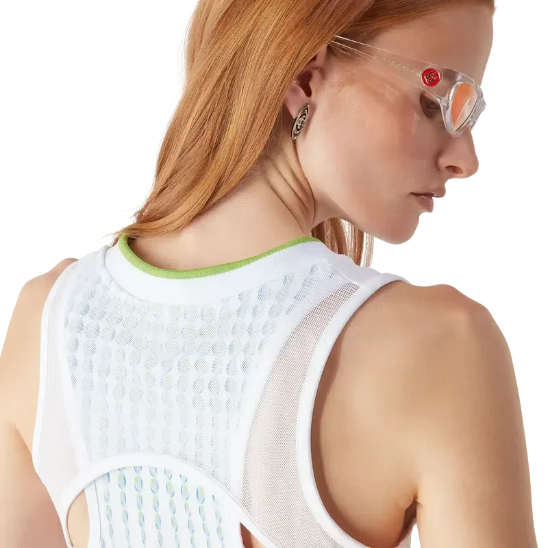 Tricoul cu imprimeu de tenis și jacquard articulați are un design fără mâneci, cu logo-ul diamant argintiu al casei. Este completat cu un decolteu în V superficial contrastant, închidere cu fermoar, corset imprimat și o siluetă slim.