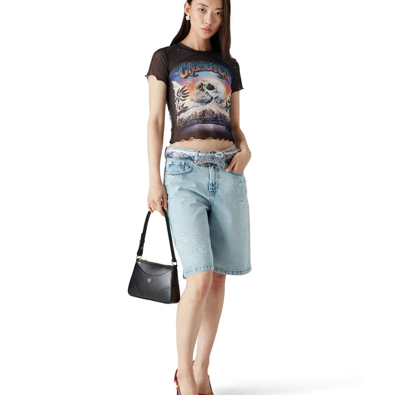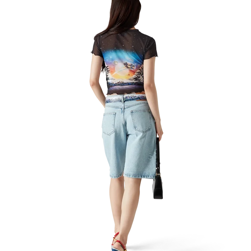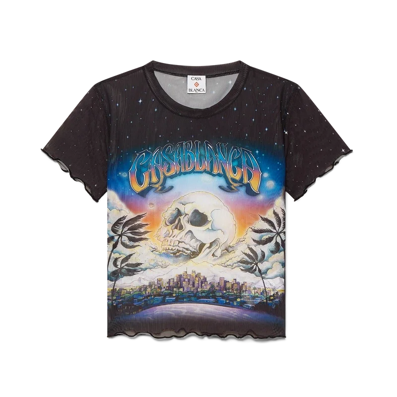 Tricoul La Pramonition Mesh este un model cu mâneci scurte, imprimat, confecționat din țesătură de plasă, cu un design caracteristic inspirat de o viziune misterioasă a orizontului orașului La noaptea, cu elemente OZN care fac referire la inspirația sci-fi vintage.