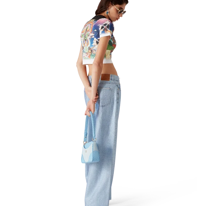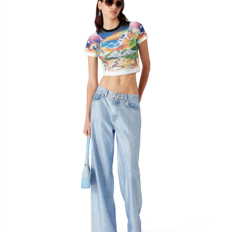 Tricou scurt La Musique este un model cu mâneci scurte, confecționat dintr-o țesătură de bumbac imprimată, cu grafica sezonului reprezentând o odă adusă lui Bootsy Collins și discurilor iconice de funk din anii ’70. Completat cu un guler rotund cu bordură contrastantă. Conceput pentru a se potrivi deasupra buricului.