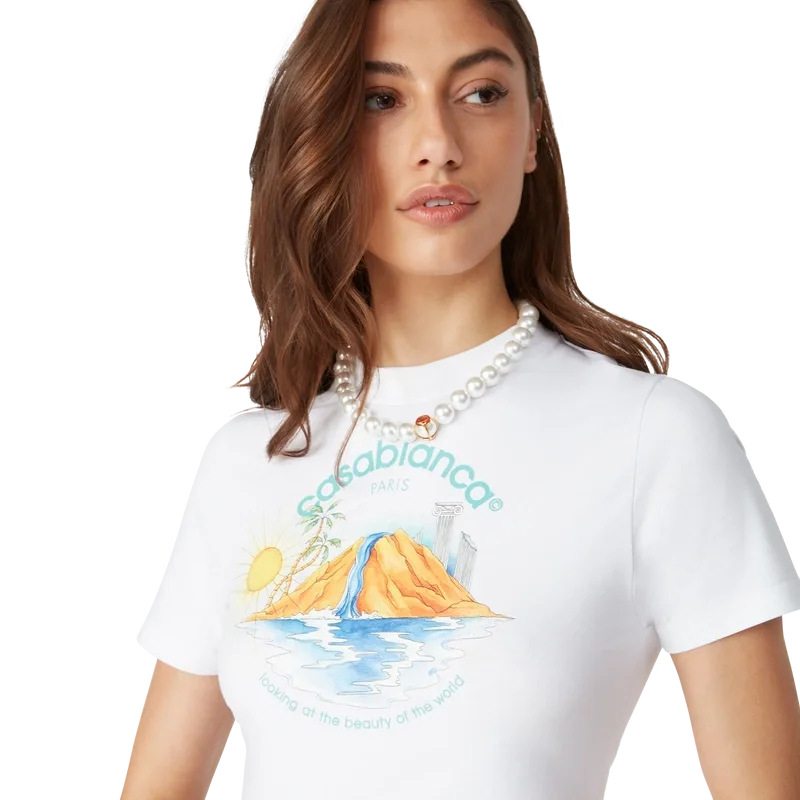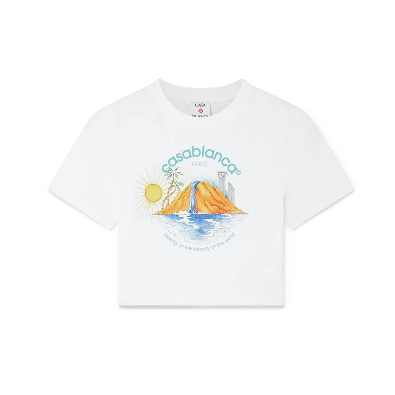 Tricou scurt Oasis este un model cu mâneci scurte și imprimeu, confecționat din bumbac organic, prezentând grafica sezonieră a casei de modă cu elemente de design inspirate din natură, arhitectură și tenis. Completat cu un guler rotund clasic. Conceput pentru a se potrivi deasupra buricului.