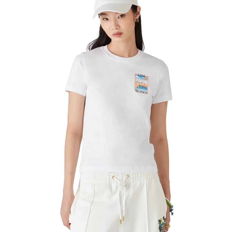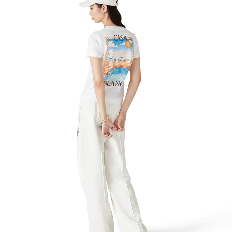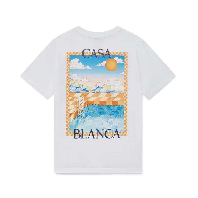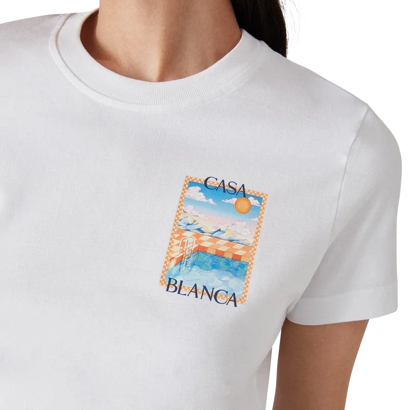 Tricoul Surreal Pool este un model cu mâneci scurte, imprimat, confecționat din bumbac organic și prezentând scene pictate manual, create special pentru această colecție. Are guler rotund clasic.